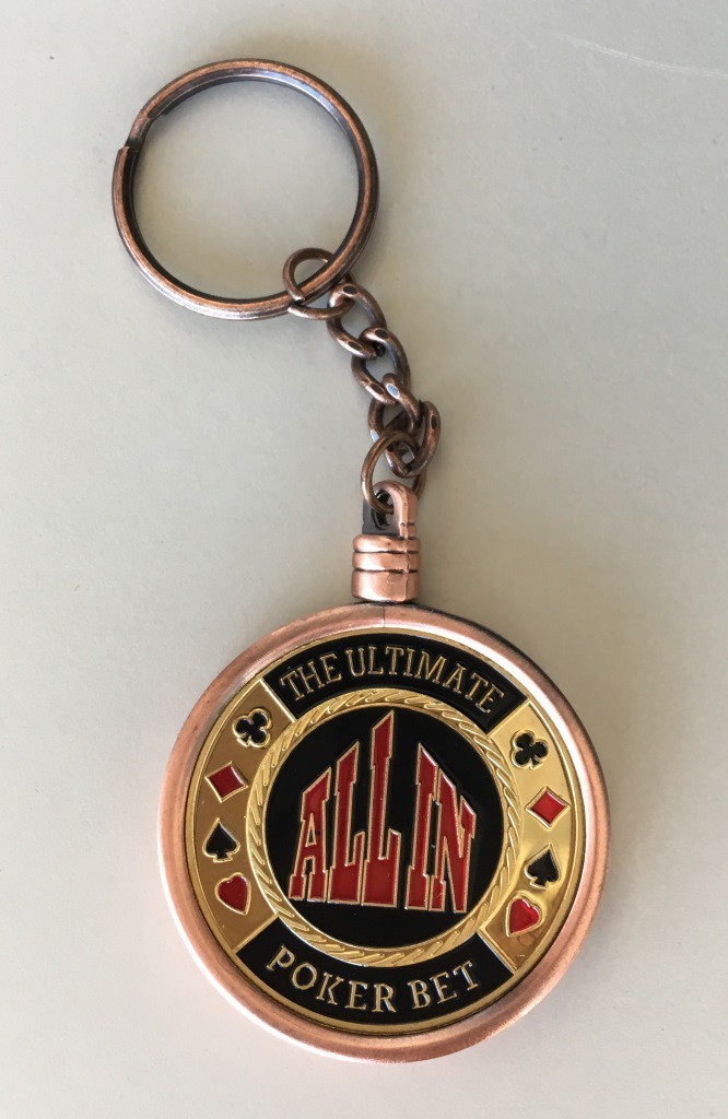 Simpaticissimo porta chips colore bronzo + card guard in metallo ALL IN, ideale anche come gadget da regalare. L’inserzione comprende 10 portachiavi completi di card guard.