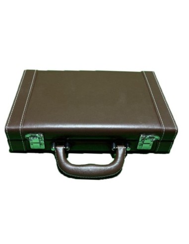 Valigetta porta fiches in similpelle marrone. Forte ed elegante può contenere fino a 200 chips da 39 mm, più due mazzi di carte e un button dealer. Chiusura di sicurezza con chiave e maniglia cromata per il trasporto.